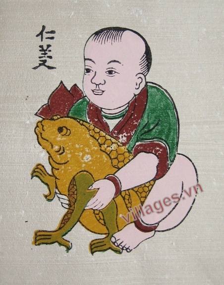 Tranh Nhân nghĩa vẽ hình em bé ôm cóc. Trong văn chương truyền miệng Việt Nam, chắc cũng chưa ai quên hình ảnh con cóc trong truyện “Cóc kiện trời”, hoặc câu ca dao: