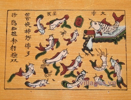 Tranh Trê Cóc của Đông Hồ, bản cổ nhất về đề tài này còn tới nay thì cóc đang đưa đơn kiện tới một quan thái thú - là một con cá chép to bự đang nằm trên sập.