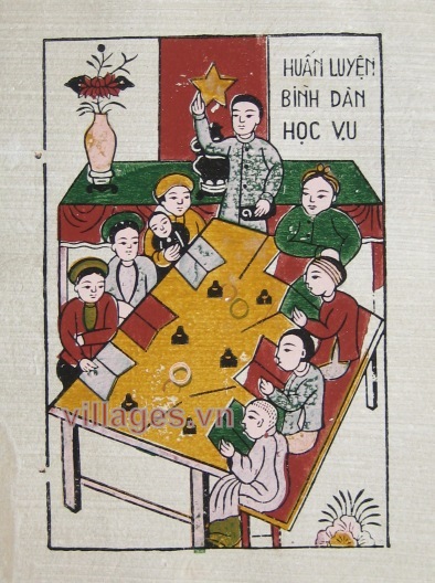 Đảng đã vận động toàn dân xây dựng nền văn hóa mới, xóa bỏ mọi tệ nạn văn hóa nô dịch của thực dân, xóa bỏ các hủ tục lạc hậu, phát triển phong trào bình dân học vụ để chống nạn mù chữ, diệt "giặc dốt". Một năm sau Cách mạng Tháng Tám đã có 2,5 triệu người biết đọc, biết viết. Giá trên áp dụng cho kích thước 26 x 37 cm, không kèm khung. Các kích thước khác (cm): 37 x 52 50 x 77 79 x 109 Có mành tre cho kích thước 26 x 37. Khung được làm bằng tre (hun khói), gỗ.