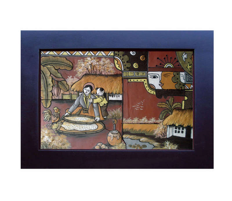 Tranh mẹ sàng gạo và phong cảnh vườn quê (60cm x 40cm)