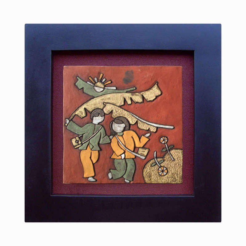 Tranh bé vui đến trường, gốm Phù Lãng (25cm x 25cm)