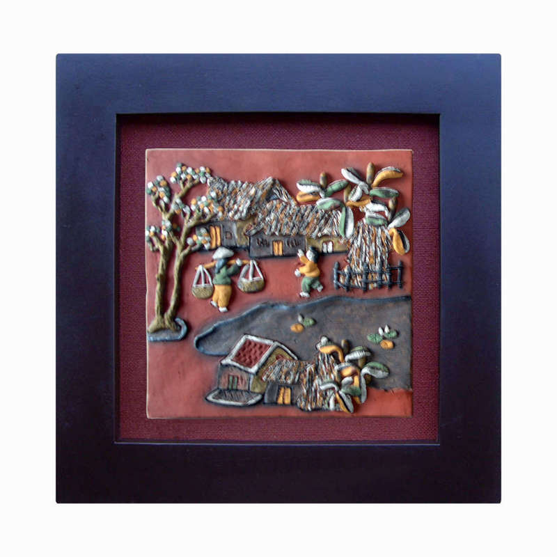 Tranh bé đón mẹ đi chợ về, gốm Phù Lãng (25cm x 25cm)