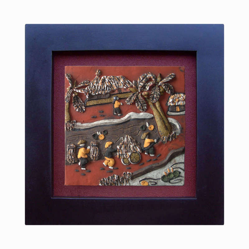 Tranh gánh lúa về nhà, gốm Phù Lãng (25cm x 25cm)