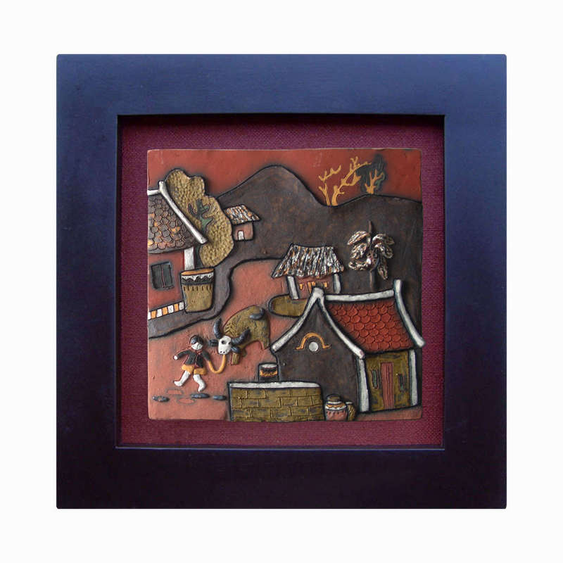 Tranh gốm dắt trâu đường làng,Tranh gốm Phù Lãng (25cm x 25cm)