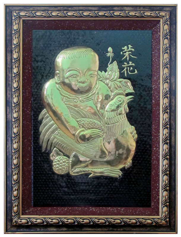 Tranh Vinh Hoa - em bé ôm gà, chất liệu đồng vàng (70cm x 50cm)