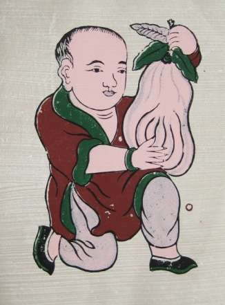 Trong dòng tranh Đông Hồ, Em bé ôm phật thủ thường được làm quà biếu treo tranh tết với ý nghĩa chúc tụng sống lâu và viên mãn.