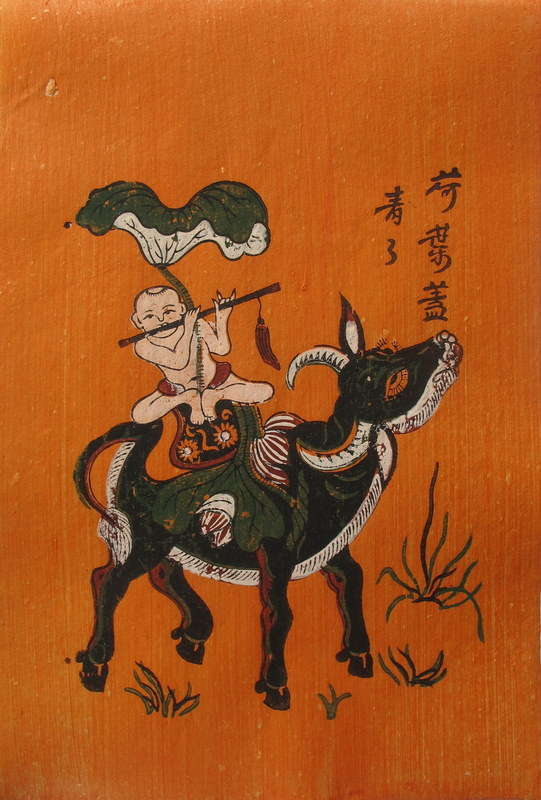 Tranh chăn trâu thổi sáo thuộc dòng tranh chúc tụng trong tranh đông hồ. Câu chữ ở bức thổi sáo là HÀ DIỆP CÁI THANH THANH